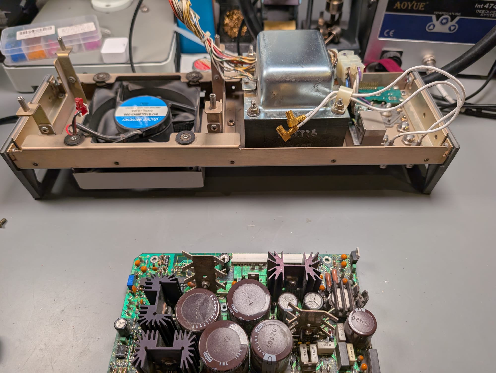 To dig deeper, I removed the entire back panel assembly, including the power supply PCB and the mains transformer, from the chassis.
