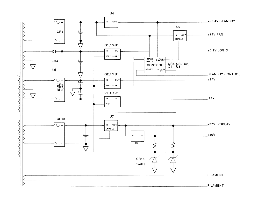 - The +23.4V or -5V standby supplies were either not present or not regulating correctly.