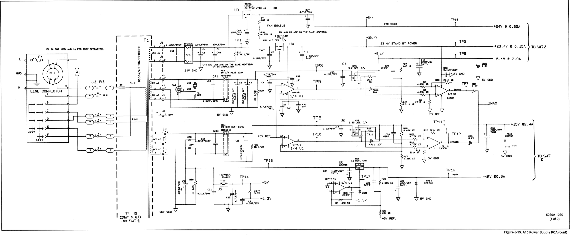 If an overcurrent event occurs on either the +5.1V or +15V supplies, the offending supply's current sense amplifier (1/2 of U2 in the schematic above) will cause its corresponding Zener diode to break down, pulling the IMAX line up and triggering SCR Q4, which pulls TP22 to ground. That causes U3-2 to drive low and U3-1 to float high, turning on Q5 and disabling the majority of the power supply.